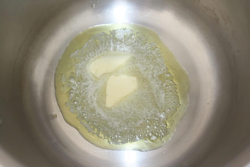Poner el aceite de oliva y la mantequilla en una cazuela a fuego fuerte.