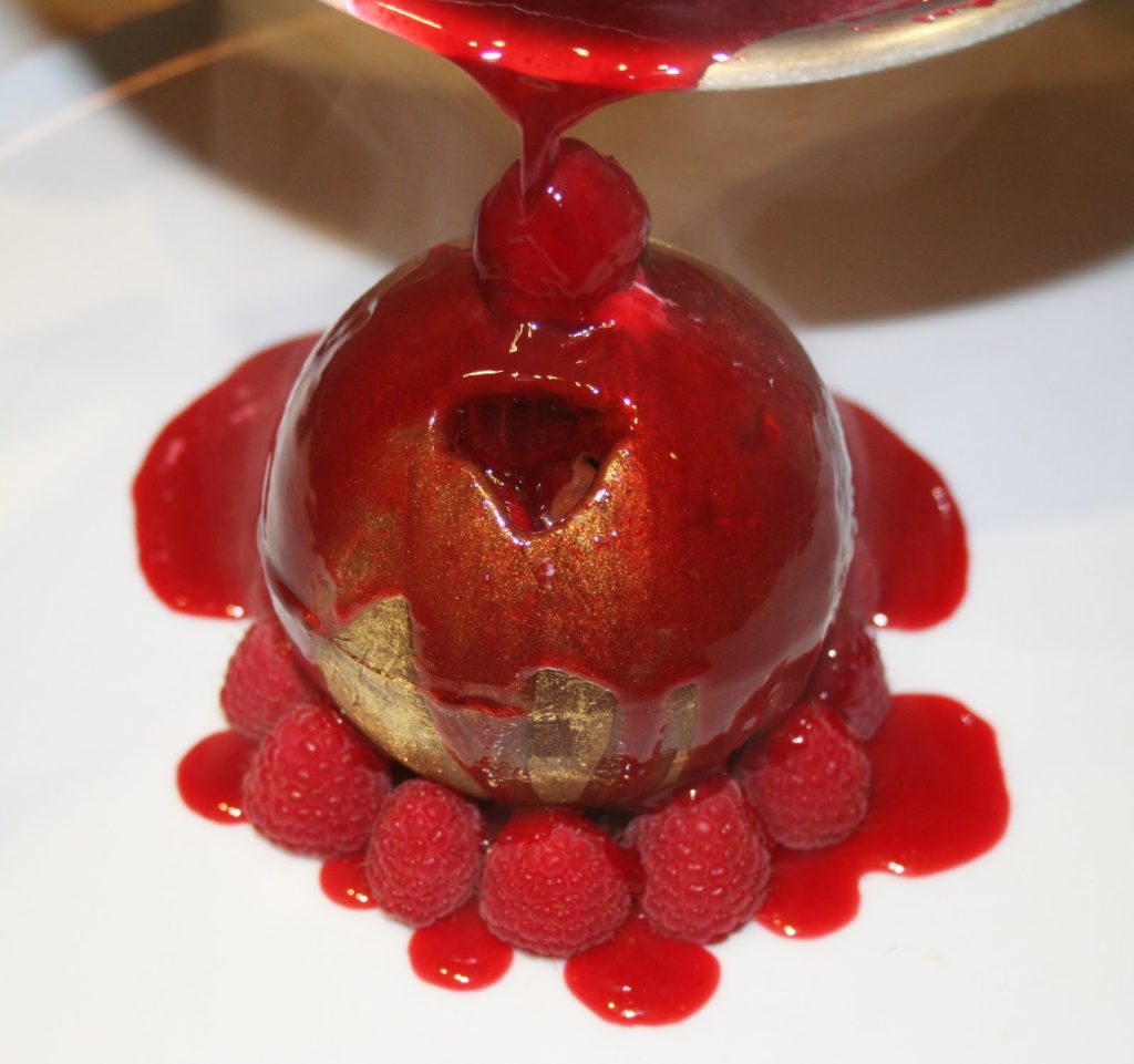 - A la dernière seconde, devant les convives, verser le coulis de framboises brûlant sur les sphères d’or, le chocolat va fondre et laisser s’entrevoir l’intérieur des boules!!