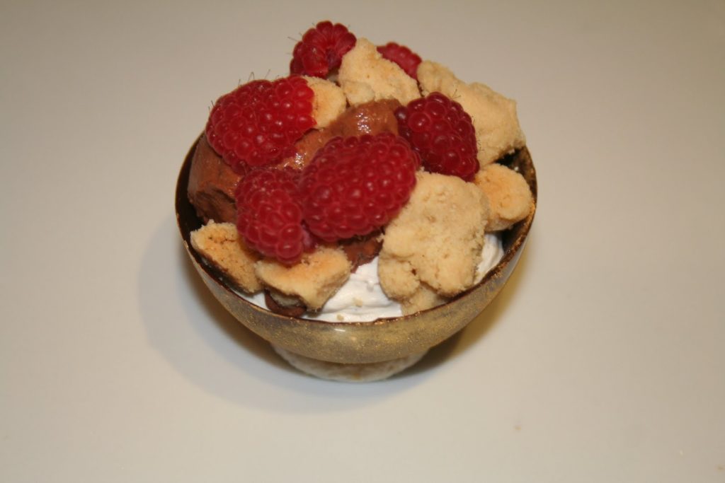 - Puis placer une boule de sorbet au chocolat, quelques framboises fraîches et des brisures de biscuits.