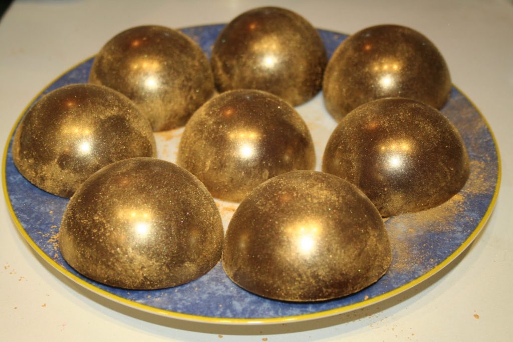 Mettre les demi-sphères, que l’on aura pris soin de préparer la veille, au frais pendant 10 minutes, juste pour les refroidir. De cette façon en sortant du froid, la condensation sur les demi-sphères, fera adhérer la poudre d’or. J’utilise pour cela un pinceau à maquillage (neuf bien sûr!!) pour saupoudrer la poudre de façon uniforme.