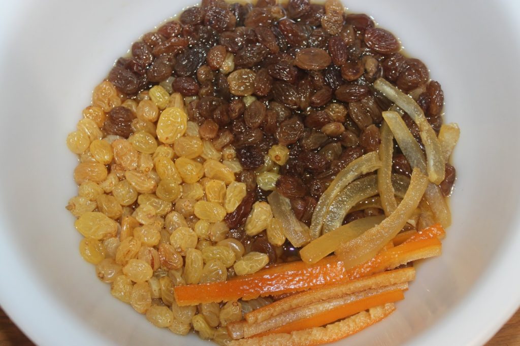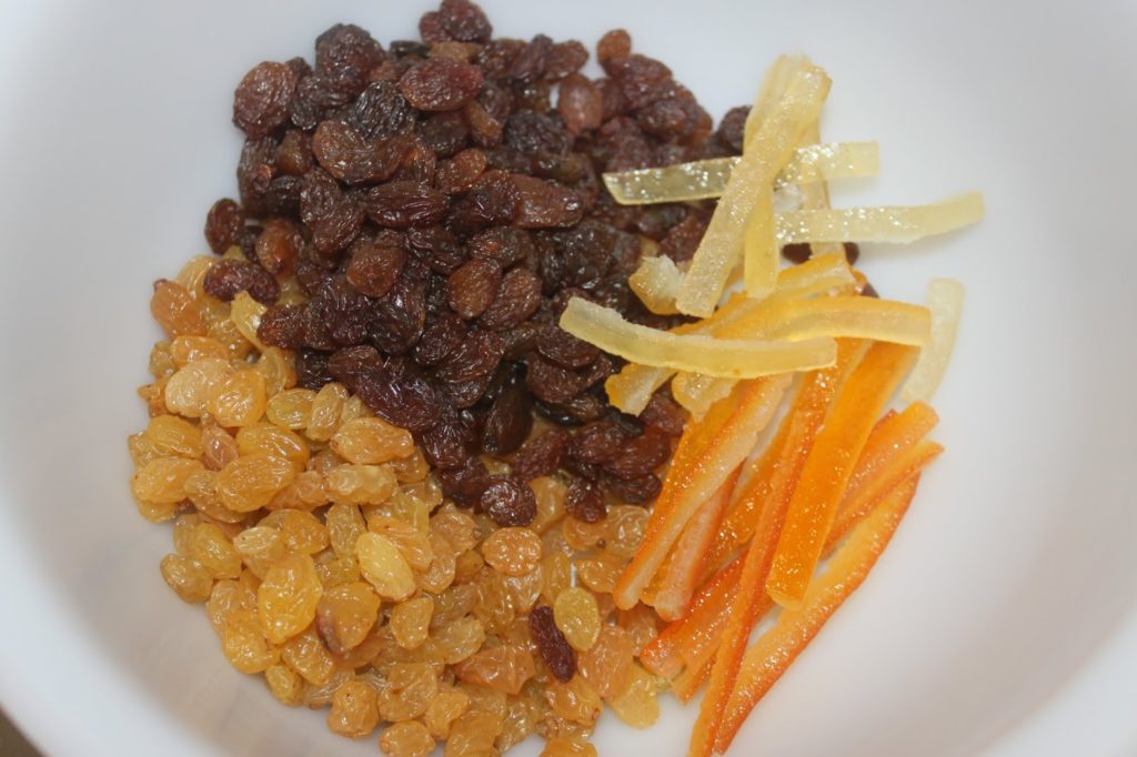 Poner las uvas, la piel de limón confitada y la piel de naranja confitada en un recipiente.