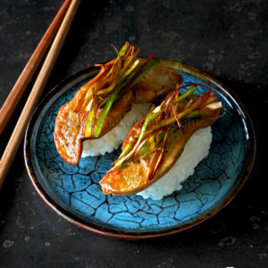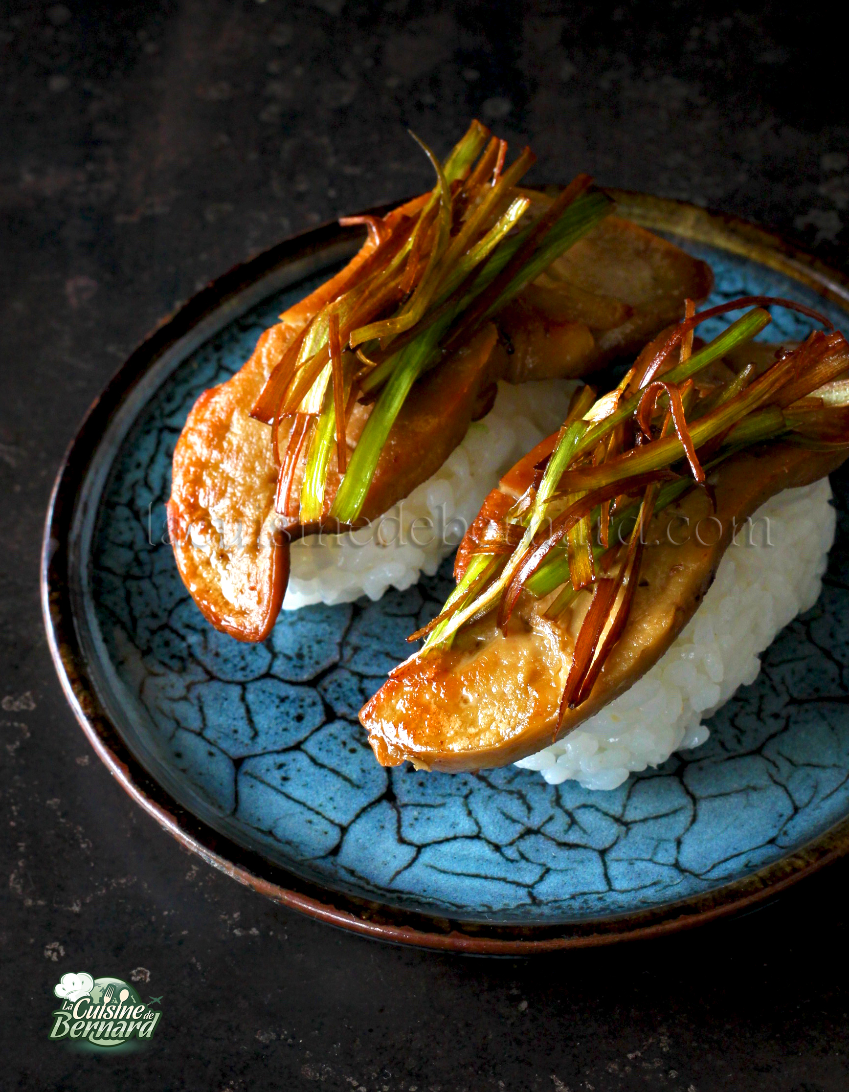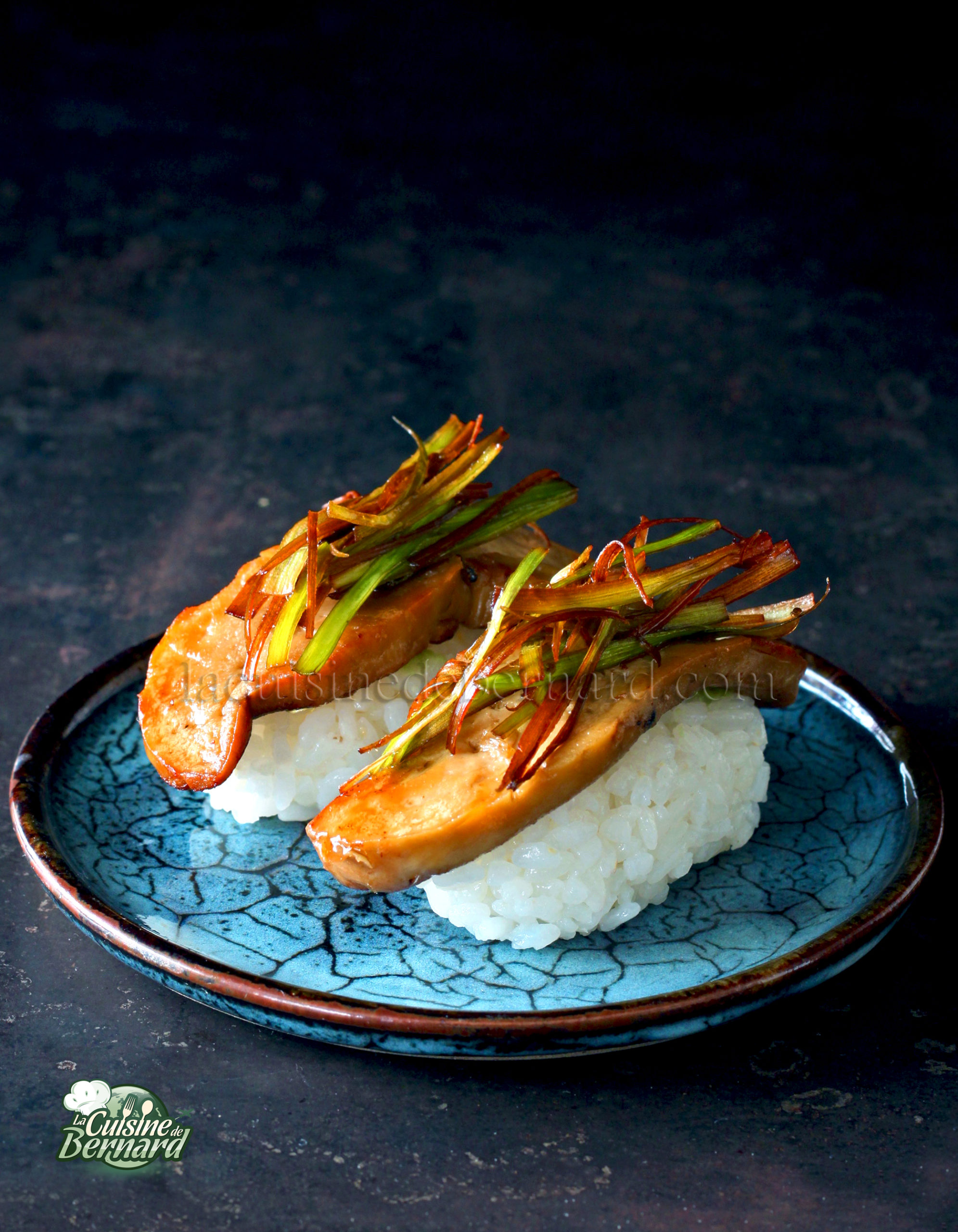 Quand vous passez à table (ce plat n’attend pas ! ) mettez une tranche de foie gras par sushi, un peu de poireau frit, et la sauce de soja à disposition !