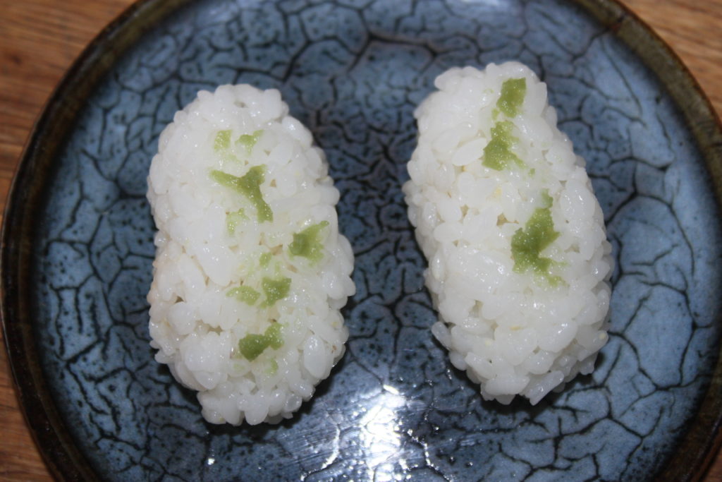 - Quand vous passez à table (ce plat n’attend pas ! ) mettez une tranche de foie gras par sushi, un peu de poireau frit, et la sauce de soja à disposition !