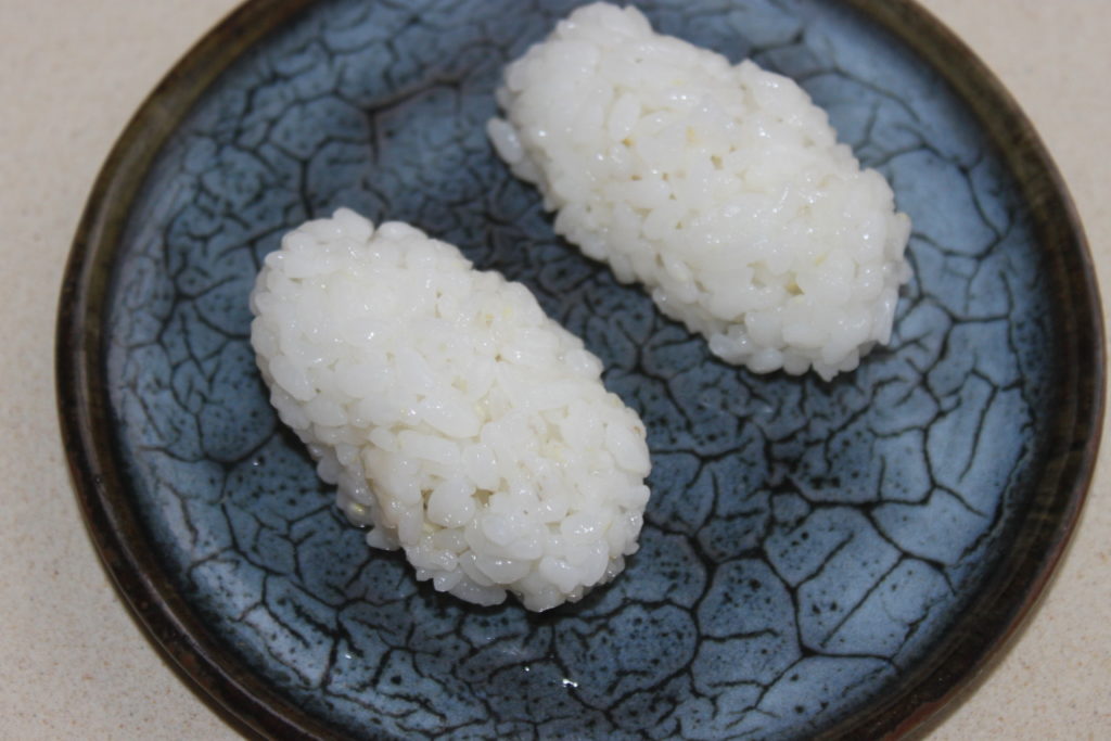 - Préparez le riz. Je fais des boulettes de 25g, en m’aidant d’un peu d’eau pour que le riz ne colle pas aux doigts. Façonnez la boulette en un joli petit sushi.