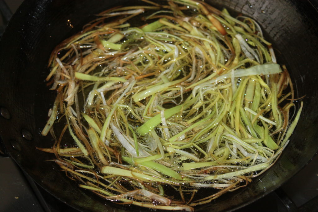 - Mettez une petite casserole ou un wok d’huile à chauffer à 180°C. Mettez le poireau à frire pour qu’il soit bien doré.