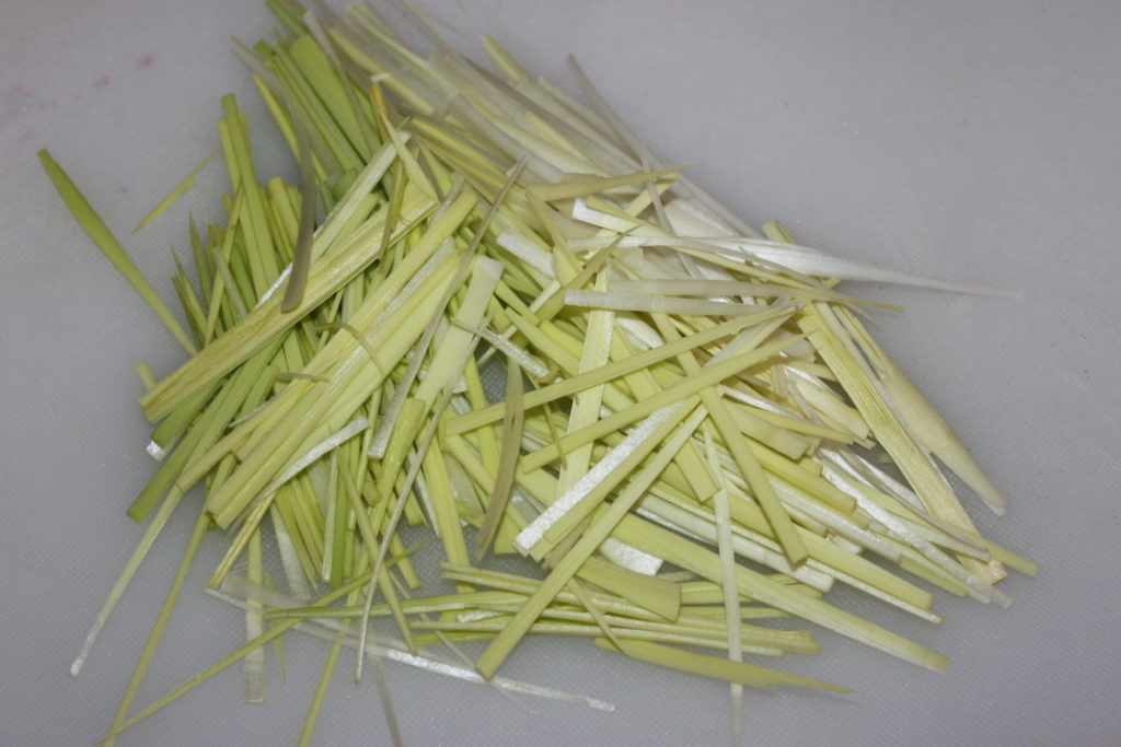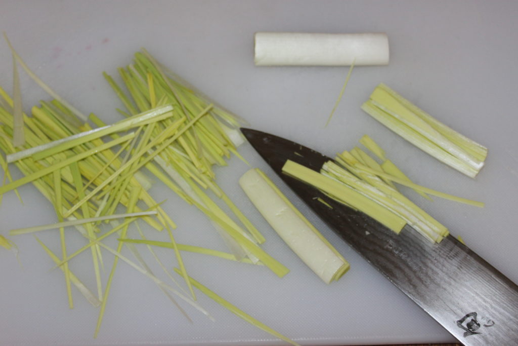 - Coupez la racine et enlevez une partie des feuilles vertes. Lavez-le et essuyez-le puis coupez-le en tronçons de 8cm. Coupez en deux chaque tronçon dans la longueur puis émincez finement.