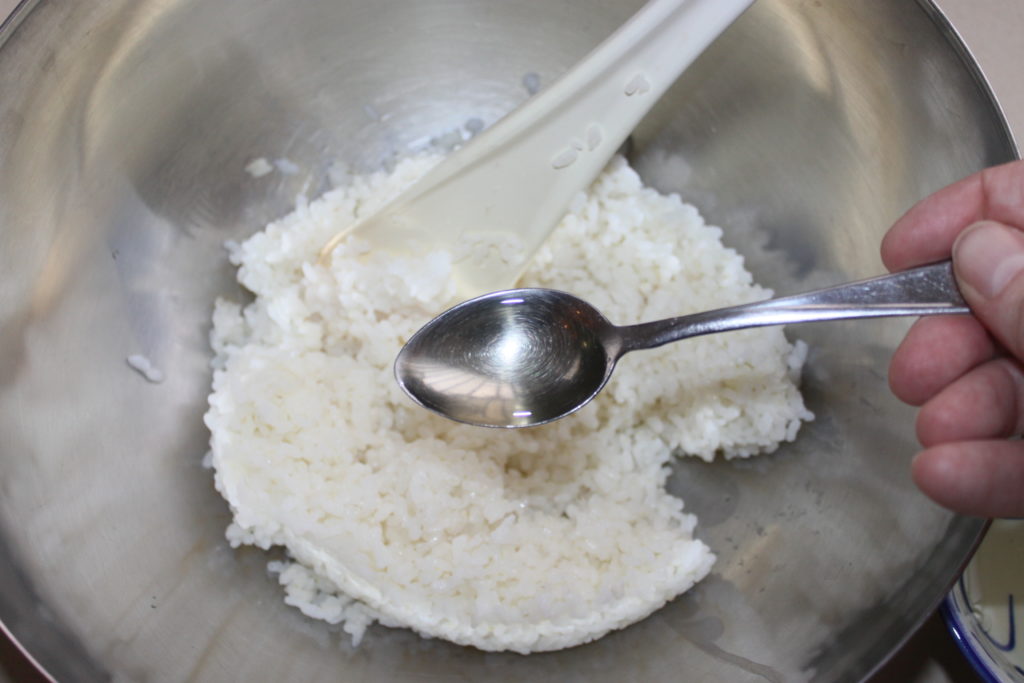 - Transvasez le riz cuit dans un récipient puis versez le vinaigre sucré petit à petit. Mélangez doucement pour ne pas briser le riz. Quand tout le vinaigre a été ajouté, mettez un film étirable au contact pour éviter son desséchement.