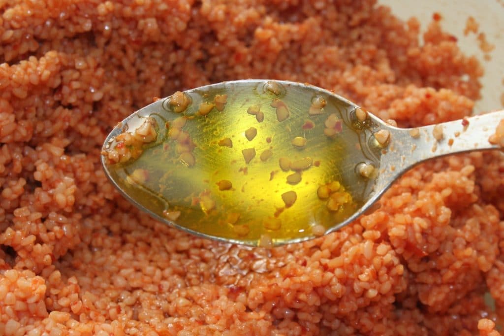 Au bout de 30 minutes, il est prêt. Versez-le dans un tamis puis pressez-le dans vos mains pour enlever l’excédent d’eau et placez-le dans un récipient. Ajoutez le concentré de piment.