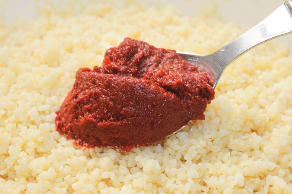 - Au bout de 30 minutes, il est prêt. Versez-le dans un tamis puis pressez-le dans vos mains pour enlever l’excédent d’eau et placez-le dans un récipient. Ajoutez le concentré de piment.
