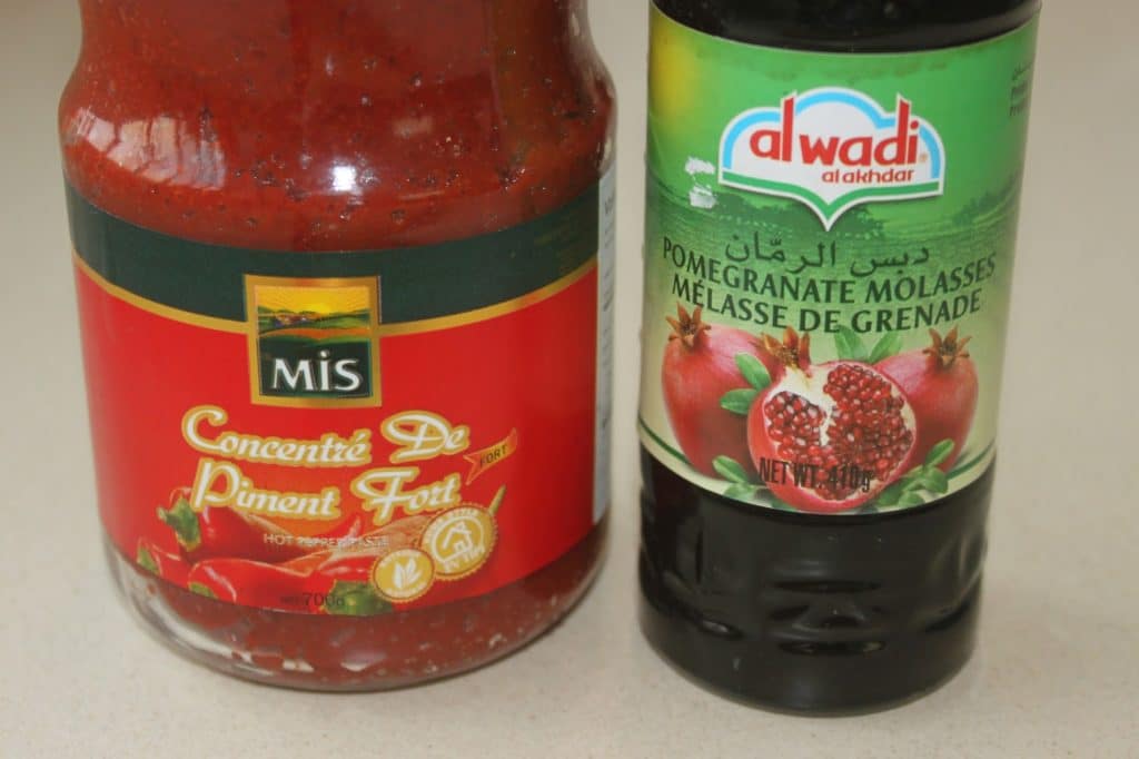 - Le concentré de piment fort (je vous rassure , il ne pique pas tant que ça !) et la mélasse de grenade. Vous les trouverez en épicerie orientale ou turque, ou même sur internet.