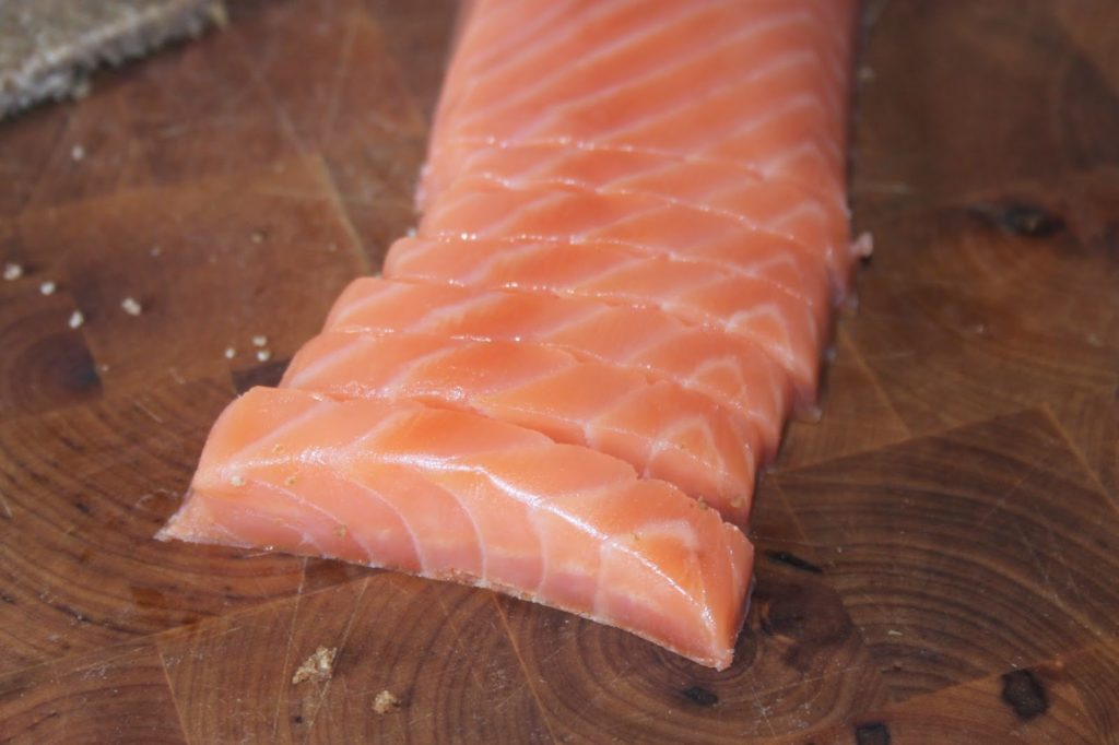 - Coupez le dos de saumon fumé en tranches de 8mm à peu près.