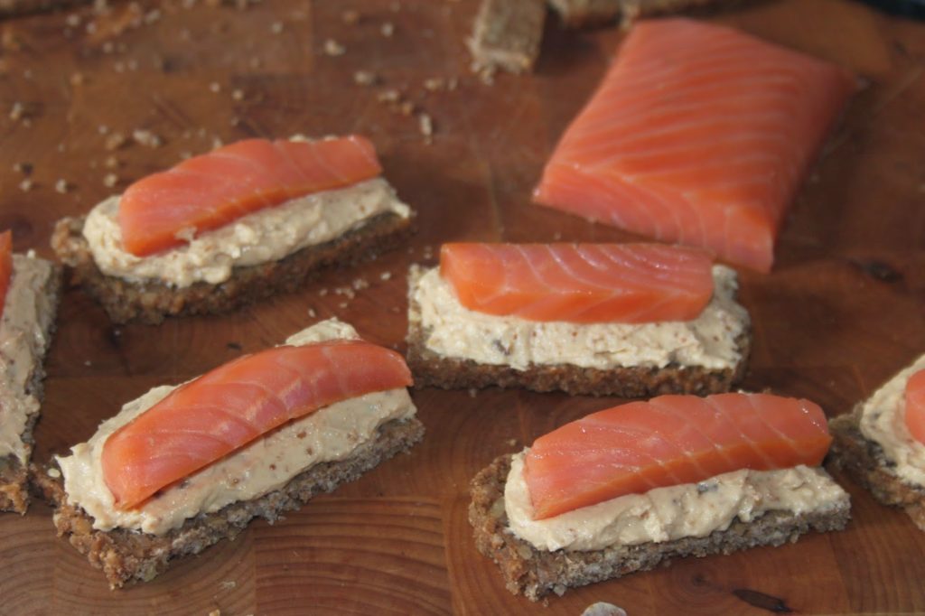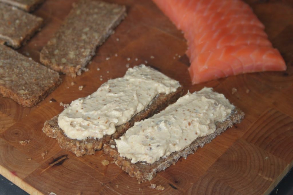 - Puis tartinez le pain avec de la crème de figues et ajoutez ensuite un morceau de saumon.