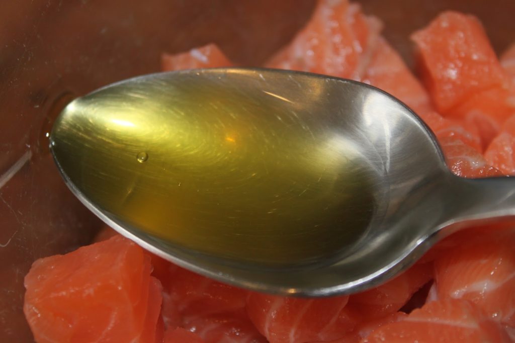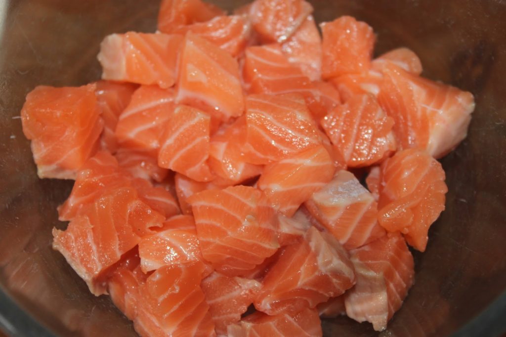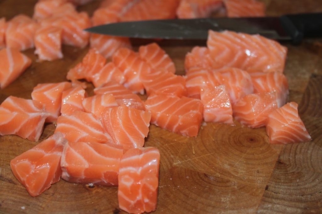 - Nettoyez bien le saumon avec un papier absorbant pour enlever les petites écailles éventuellement collées. Coupez-le ensuite en morceaux pas trop petits. On veut ici des petites bouchées.