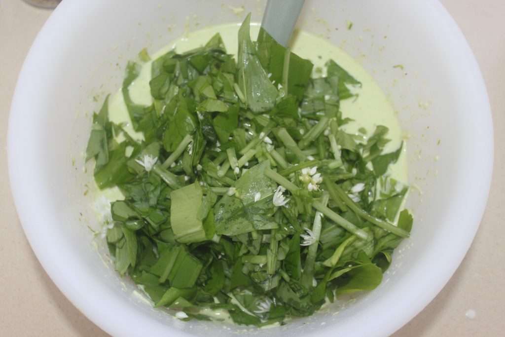 - Hachez l’ail des ours préalablement lavé et essoré, fleurs comprises, et versez le tout dans la crème.