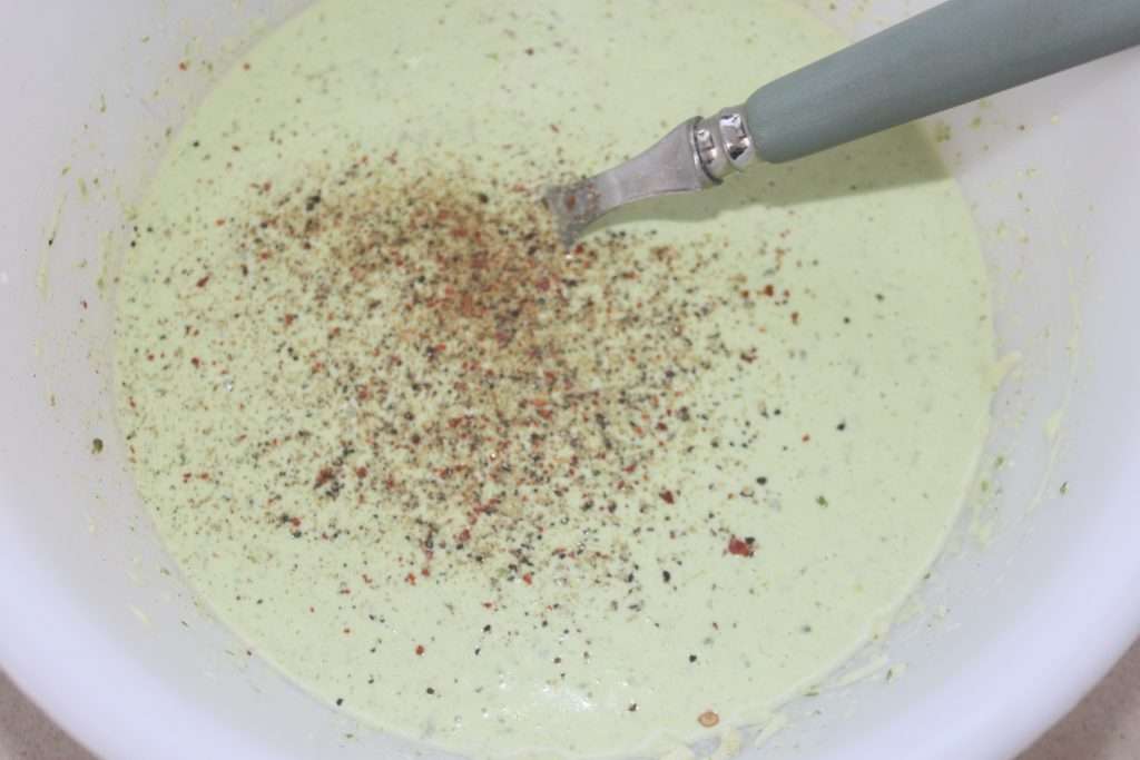 Mezclar bien, añadir sal y pimienta. También añado un poco de chile en polvo.
