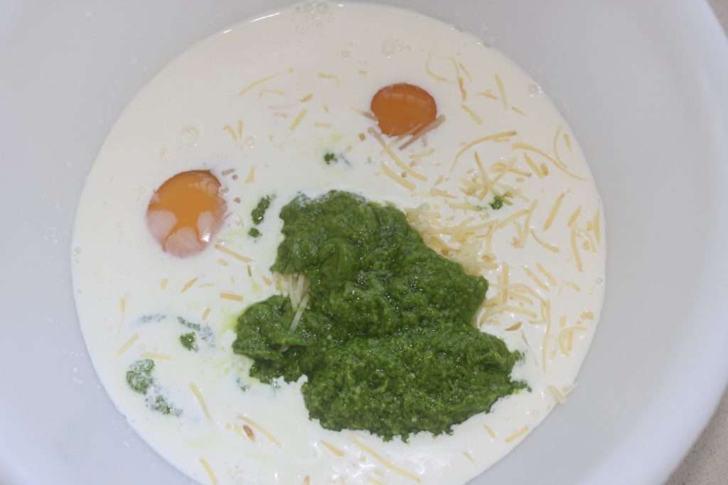 - Versez dans un récipient, les œufs, la crème entière (liquide ou non), le pesto et le comté.