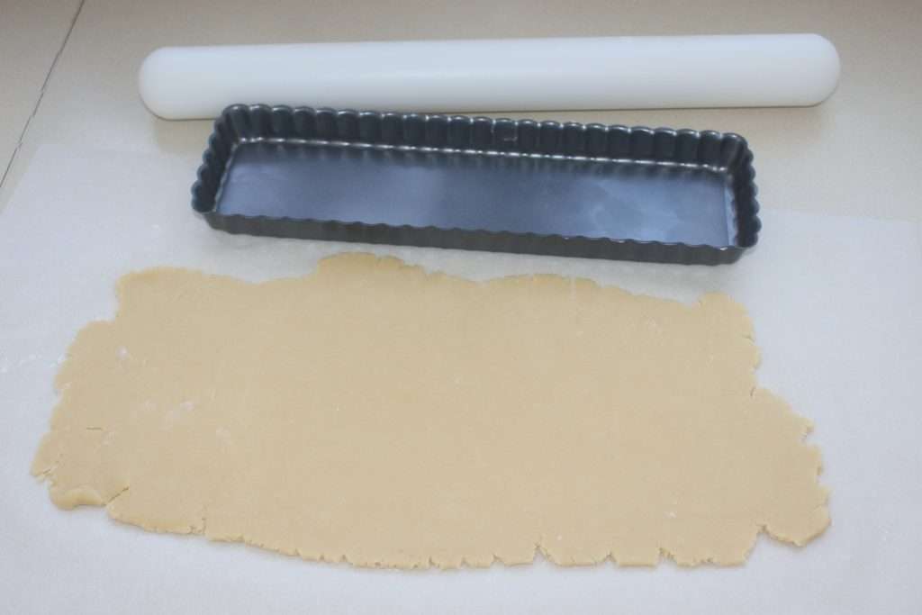 En primer lugar, prepare la masa como se describe en la receta AQUÍ. Tomé mi masa de empanada que es perfecta. Extender la mitad de la masa (envolver y congelar el resto). Aquí estoy utilizando un molde rectangular, pero la receta es válida para un molde circular de 20 cm de diámetro. Sólo quería cambiar el formato de la foto.