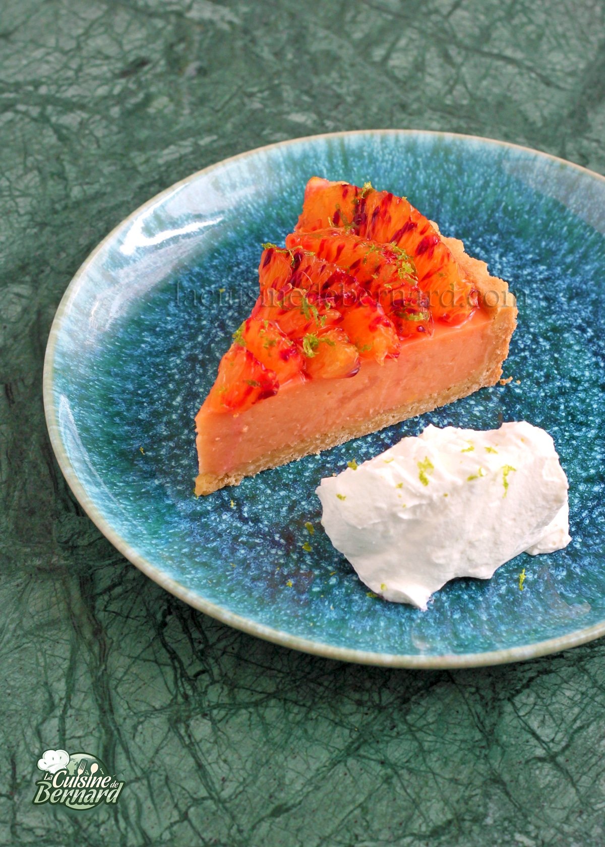 Une jolie tarte de saison à l’orange sanguine avec des suprêmes pour la décoration. J’ajoute dans ma crème, un peu de jus de citron vert et quelques framboises pour relever le tout et je verse le tout dans un fond de tarte cuite à blanc. Le résultat est crémeux et juteux, bien que croustillant à la fois ! Un vrai délice bien frais. Je vous conseille de la préparer la veille pour qu’elle soit bien froide et de la servir avec une chantilly au citron vert…