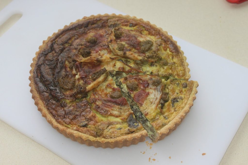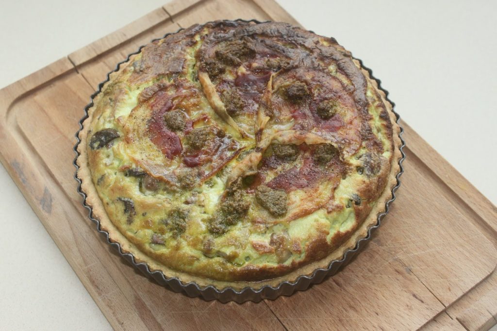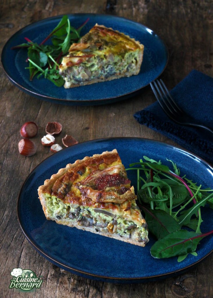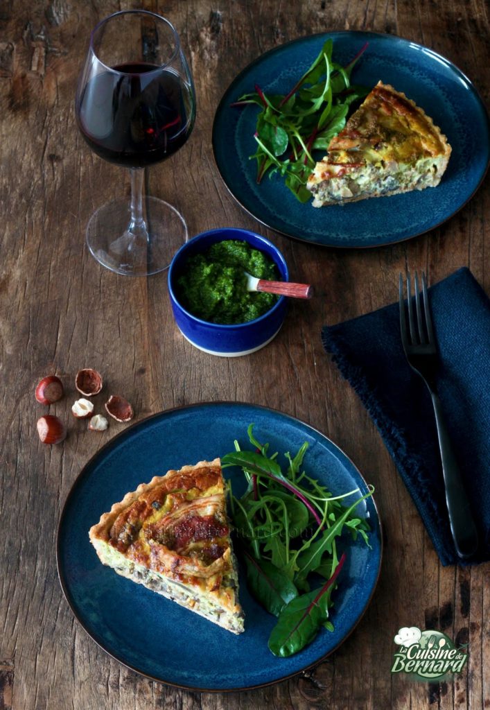 Tarte aux champignons, pesto de noisettes et pancetta