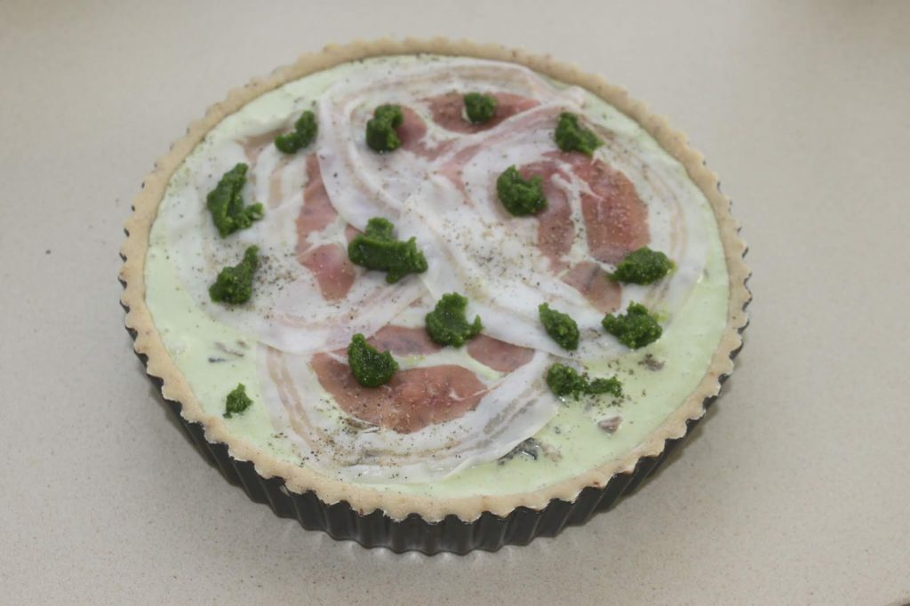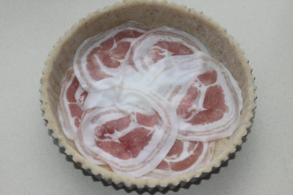 - Placez la moitié de la pancetta dans le fond de la tarte.