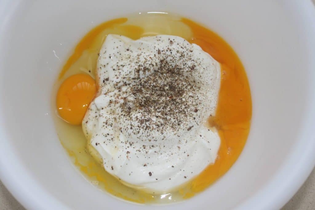 - Dans un récipient, mélangez la crème épaisse entière, les deux œufs. Salez, poivrez et mettez un peu de noix de muscade fraichement râpée.