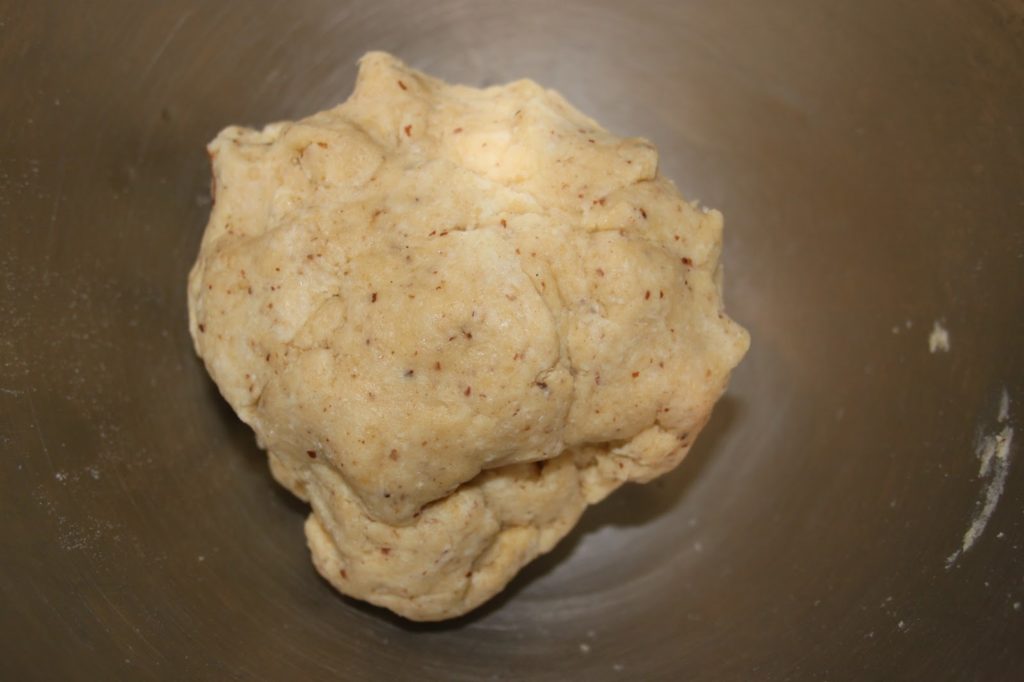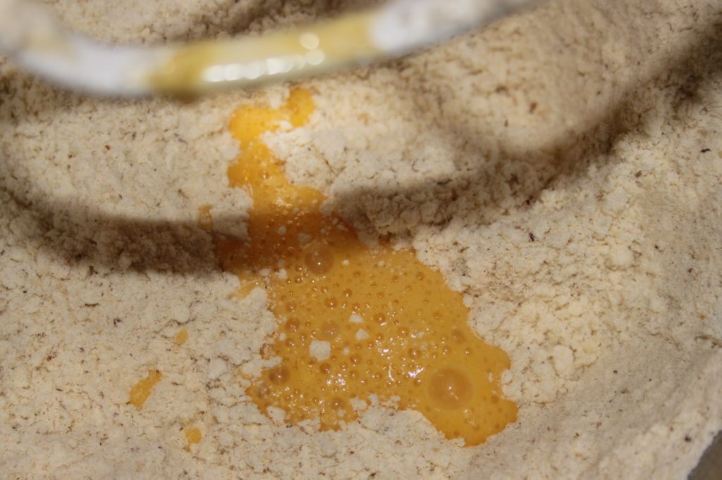 - Sablez bien le tout avec la feuille du robot ou à la main. Ajoutez l’œuf battu. Le mélange reste sableux, ajoutez alors de l’eau froide en très petite quantité et en filet (tout en mélangeant) jusqu’à obtenir une pâte (environ 15g).
