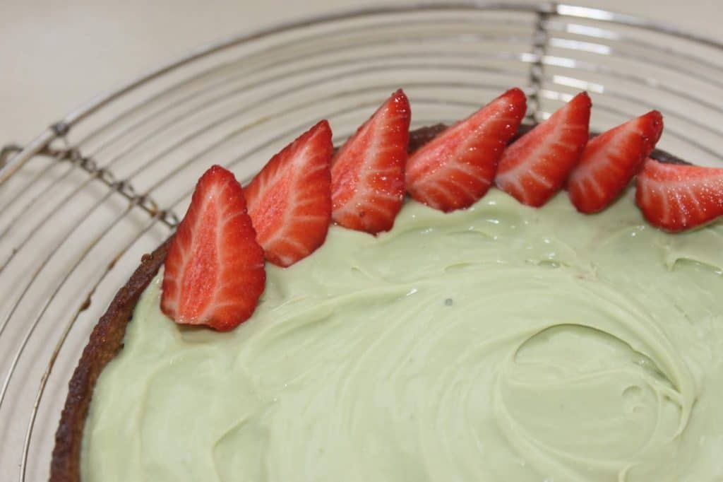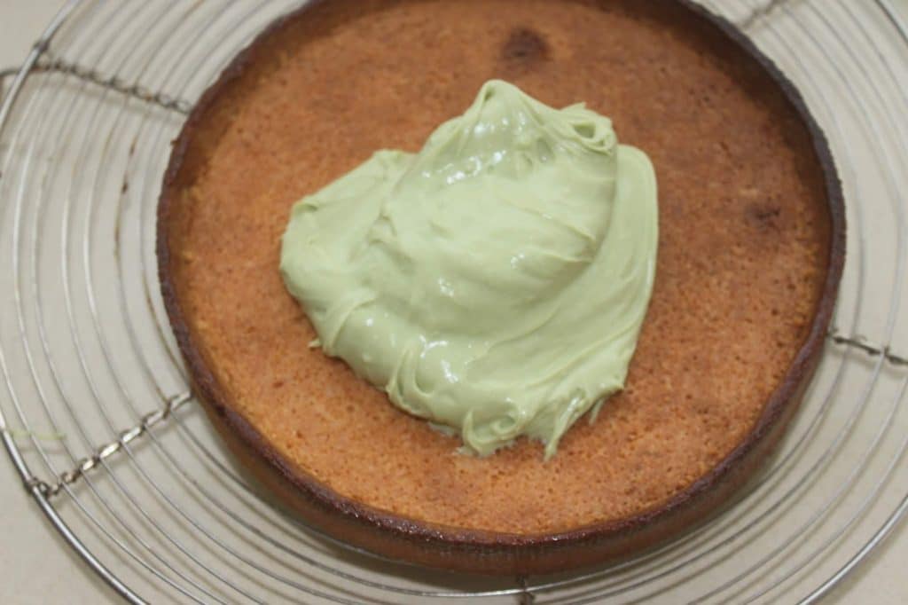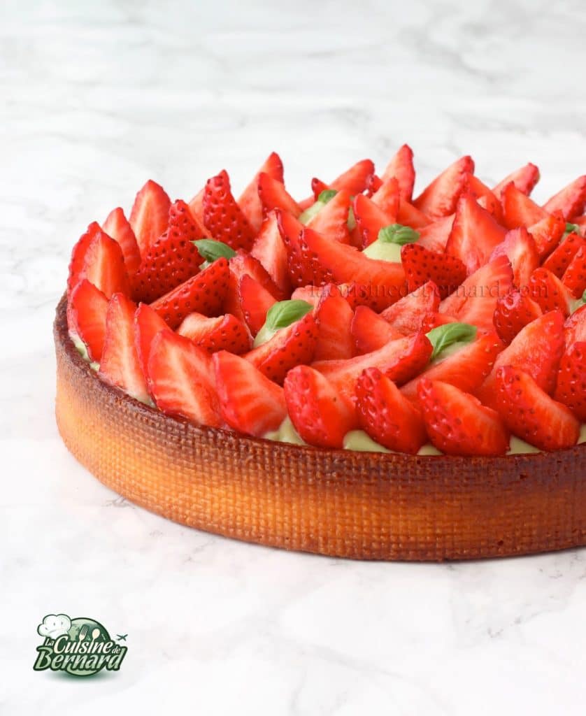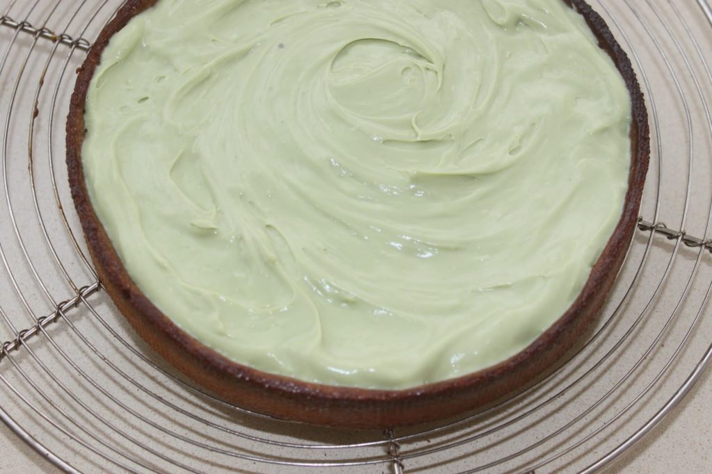 - Laissez refroidir parfaitement la tarte.Enlevez alors le film étirable du crémeux au basilic.