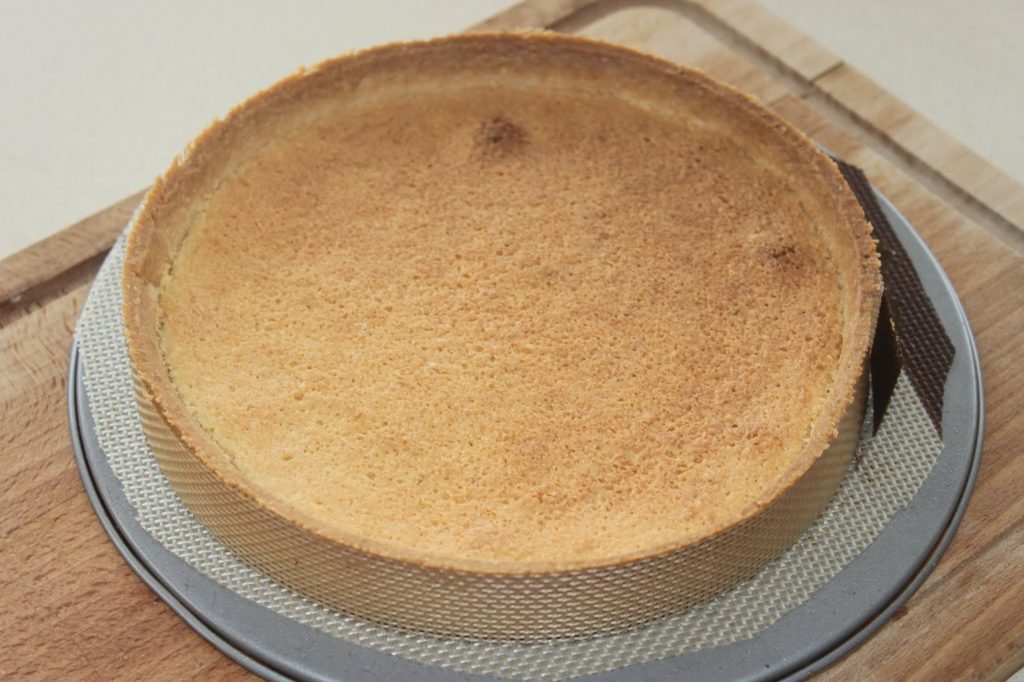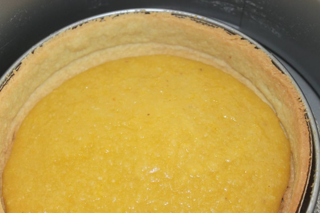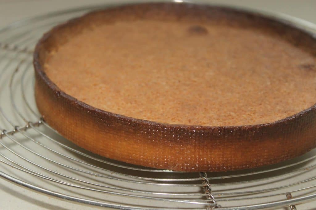 - Je n’ai pas pris de plaque de cuisson, j’ai pris le fond d’un moule à manqué à bord amovible. Pourquoi? Car les plaques de cuisson ont une fâcheuse tendance à se tordre sous l’effet de la chaleur. Après le repos au frais, faites cuire le fond de pâte à 175°C pendant 18 minutes. Sortez le cercle du four, versez la crème d’amande au citron (il faut la sortir au moins 1 heure avant du réfrigérateur). Avec la chaleur elle va fondre et s’étaler.