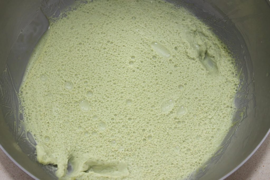 - Mixez avec un mixeur plongeant le plus finement possible. Vous ne devez presque plus voir de morceaux de feuilles de basilic.