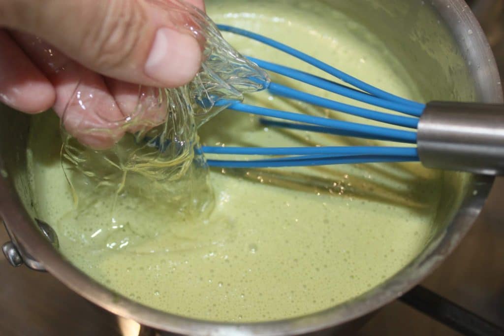 - Hors du feu, ajoutez les feuilles de gélatine préalablement trempée dans de l’eau froide et essorée.