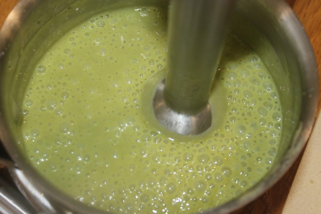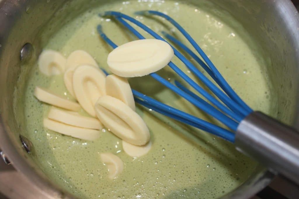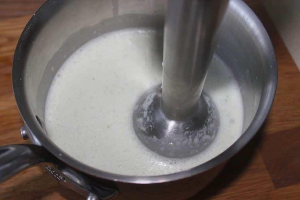 - Mélangez bien jusqu’à ce que le chocolat blanc ait fondu, puis mixez quelques secondes avec le mixeur plongeant.