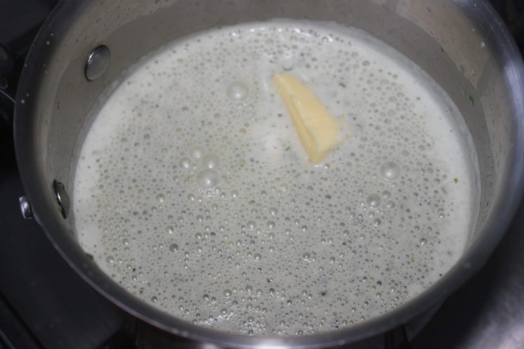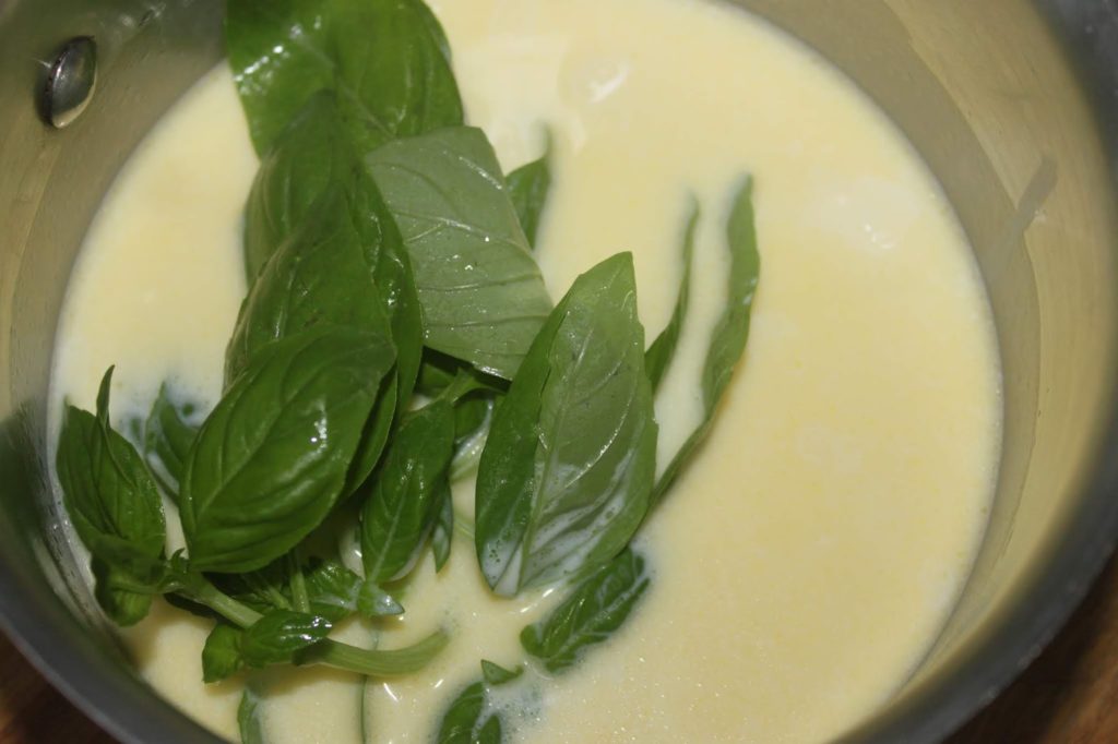 - Pour le crémeux basilic, placez la crème, le lait et le basilic dans une casserole.