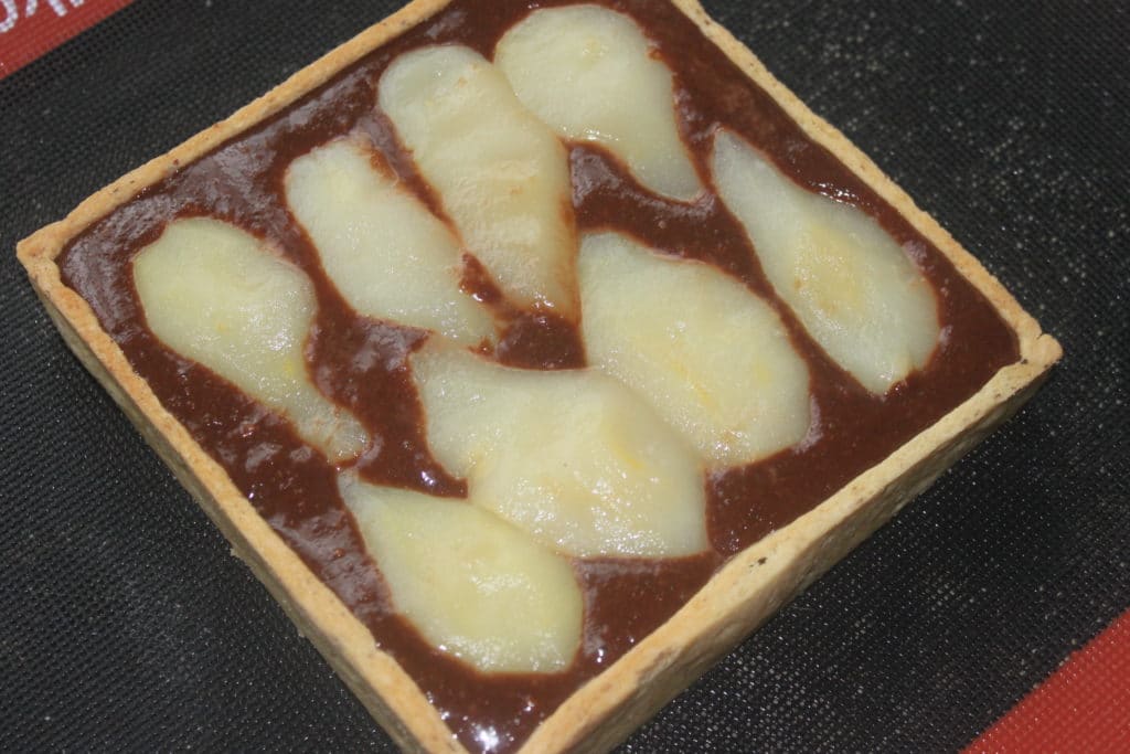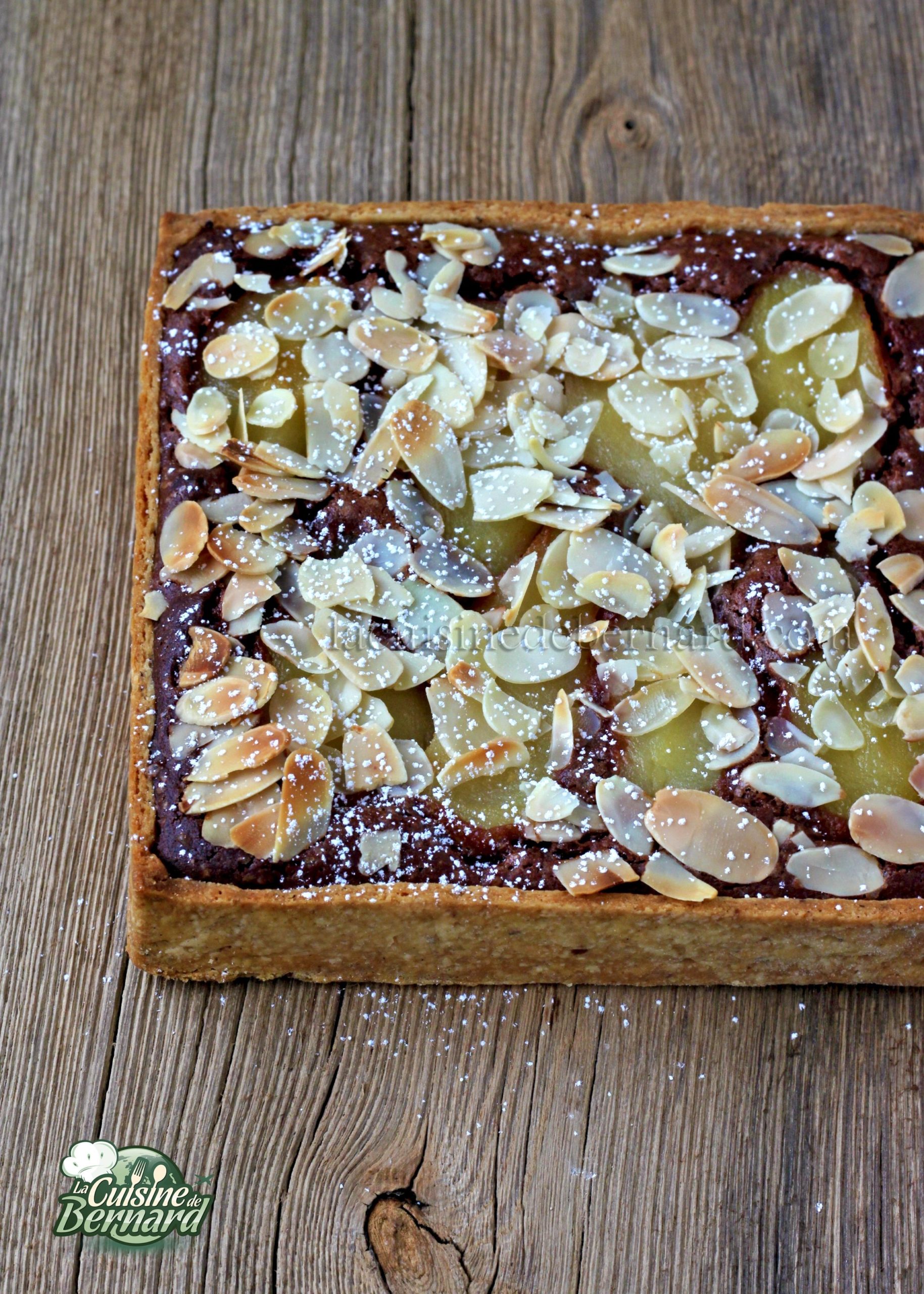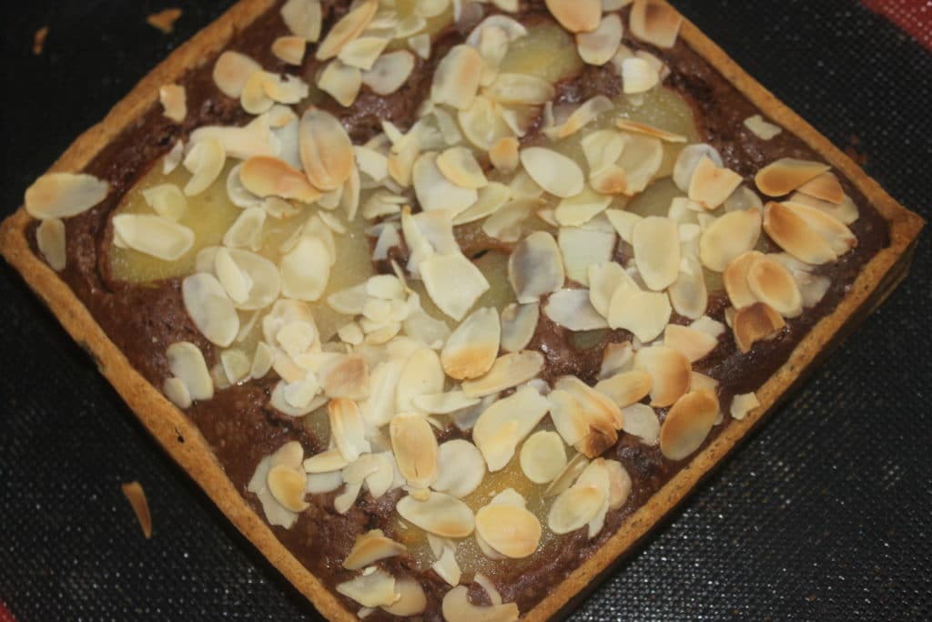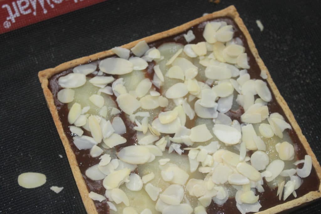 Recette pour une TARTE AUX POIRES, CHOCOLAT ET AMANDES carrée de 18x18x3,5 cm ou un cercle de 20cm :