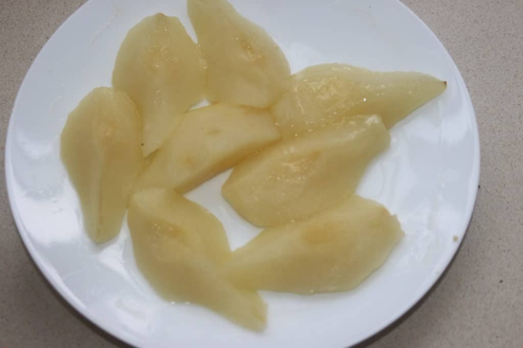 Je les ai faites cuire ici au four à micro-ondes pendant 5 minutes avec un couvercle. Elles cuisent parfaitement de cette façon. Vous pouvez aussi prendre des poires au sirop ou les pocher vous-mêmes au sirop.