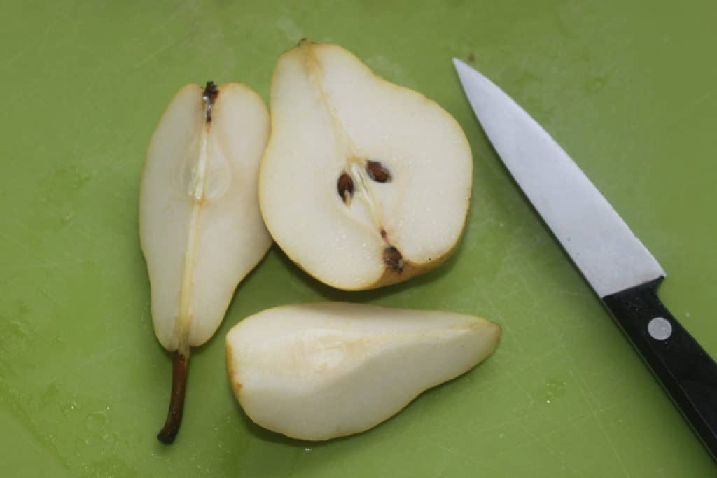 Épluchez et coupez les poires en quartiers. Tout dépend de leur taille. J’en ai mis ici deux, mais vous pouvez ne préparer 3 et au pire vous les dégusterez comme cela !