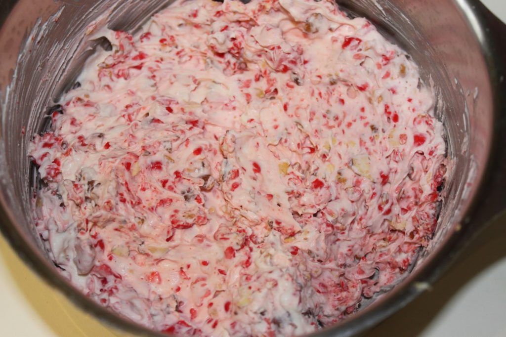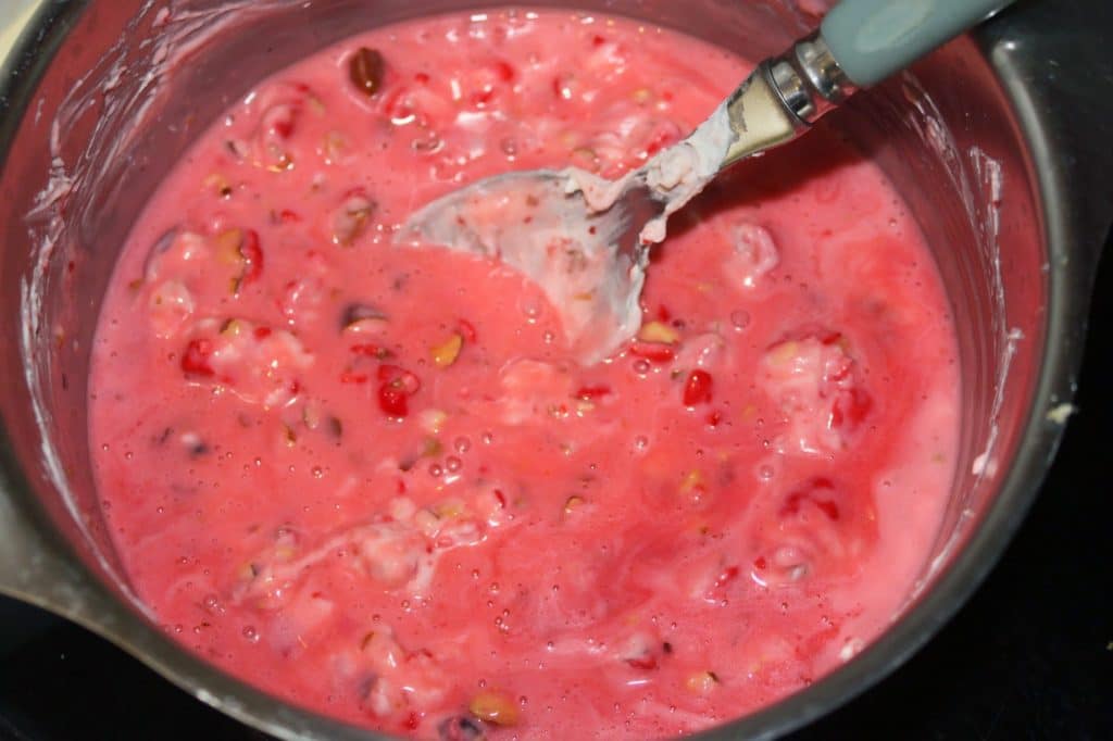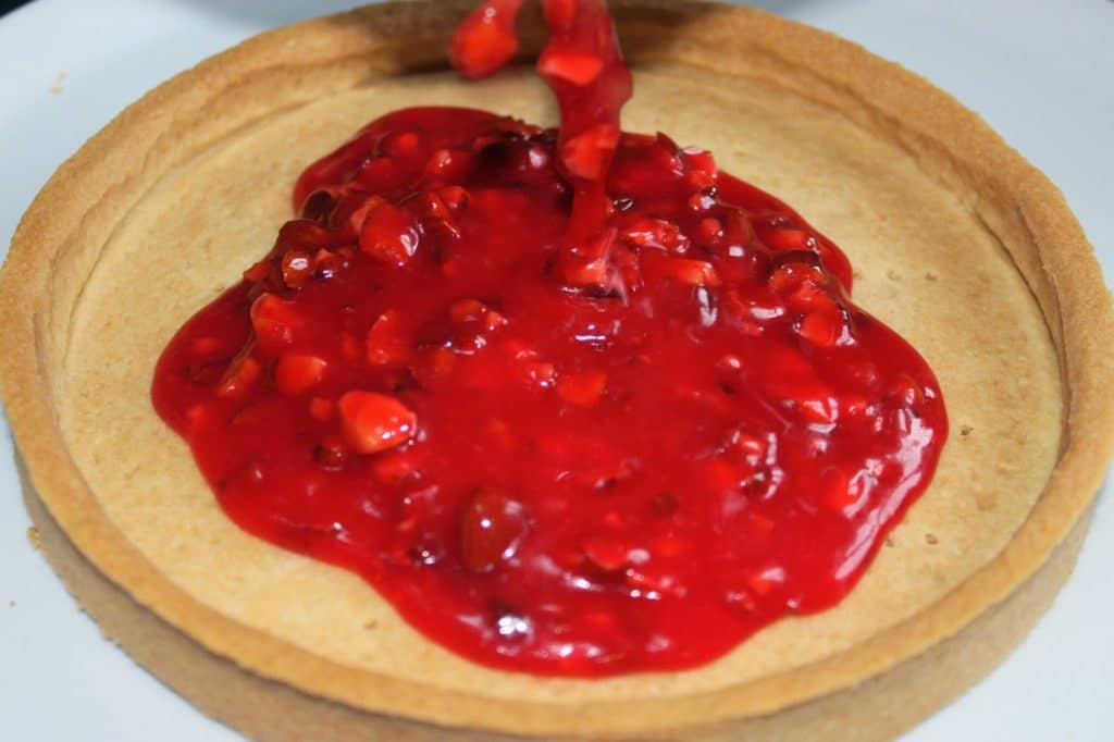 - Versez la crème (rouge à ce stade) dans le fond de pâte cuite.