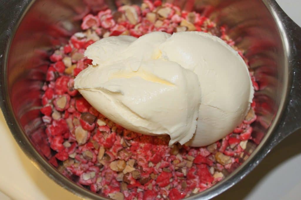 - Mettez la crème fraiche épaisse à 40% et les pralines roses concassées dans une grande casserole.