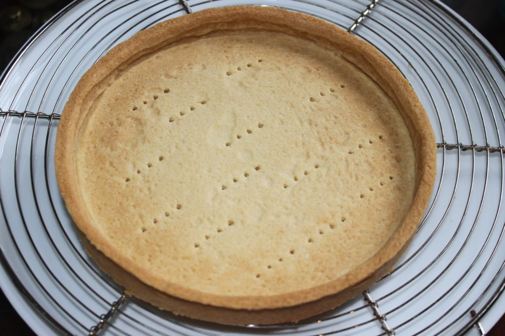 La pâte doit être joliment dorée. Sortez le tout et décerclez soigneusement. Posez la pâte cuite sur une grille à pâtisserie.