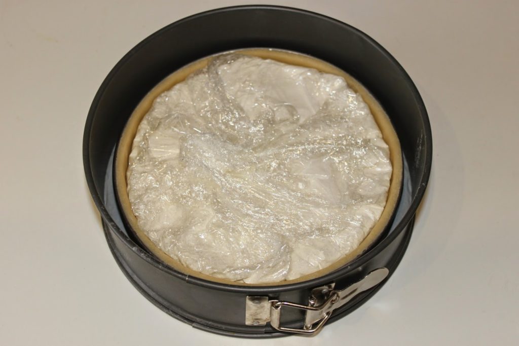 - Placez du film étirable (spécial micro-ondes) sur la pâte et remplissez ce sac de farine. Refermez le petit baluchon pour qu’il remplisse bien toute la pâte.