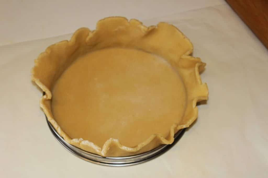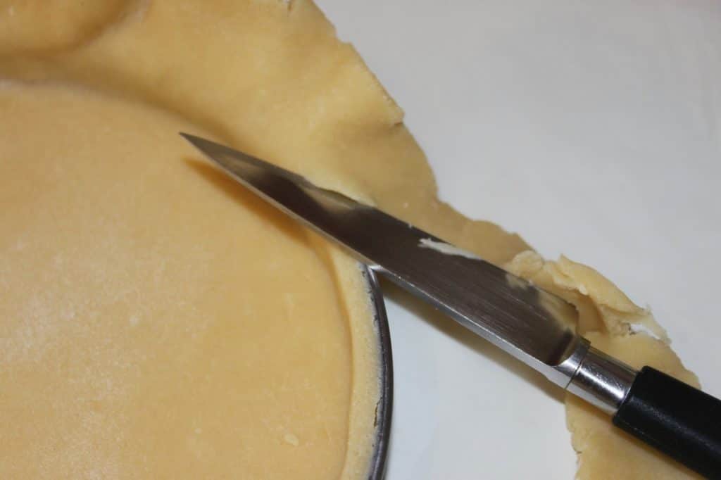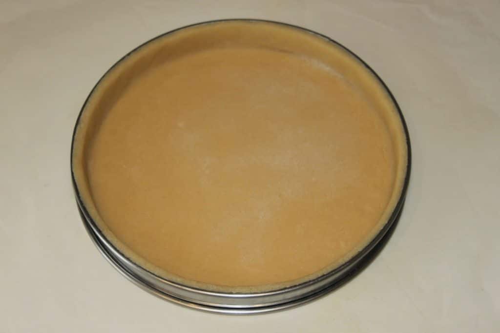 Si il fait chaud chez vous, mettez au frais pour que la pâte soit manipulable. Posez la pâte étalée sur le cercle, lui-même posé sur le papier sulfurisé. N’oubliez pas de graisser l’intérieur de votre cercle.