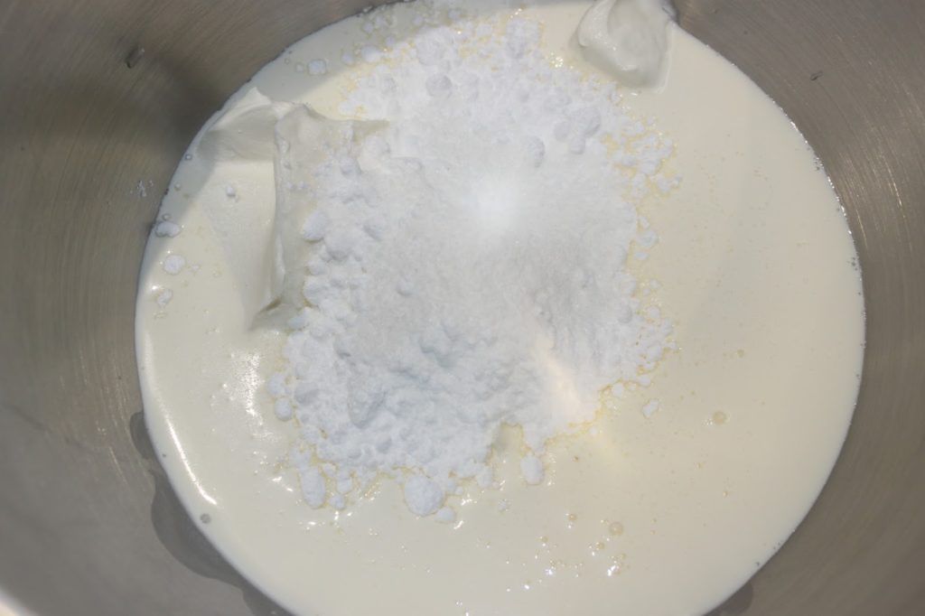 - Pour la chantilly : versez tous les ingrédients dans la cuve du robot muni du fouet. La crème bien froide, le mascarpone bien froid, le sucre glace et le sachet de chantifix. On trouve ce dernier de la marque Vahiné dans tous les supermarchés et permettra à la chantilly de tenir plusieurs jours.