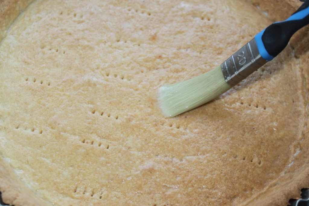 - Refaites cuire cette fois jusqu’à obtenir une belle coloration de la pâte (de nouveau 15 ou 20 minutes). Il faut maintenant l’étanchéifier pour la protéger des bananes. J’utilise pour cela du blanc d’œuf que j’applique au pinceau. Mettez-en une fine couche puis remettez à cuire 7 minutes.