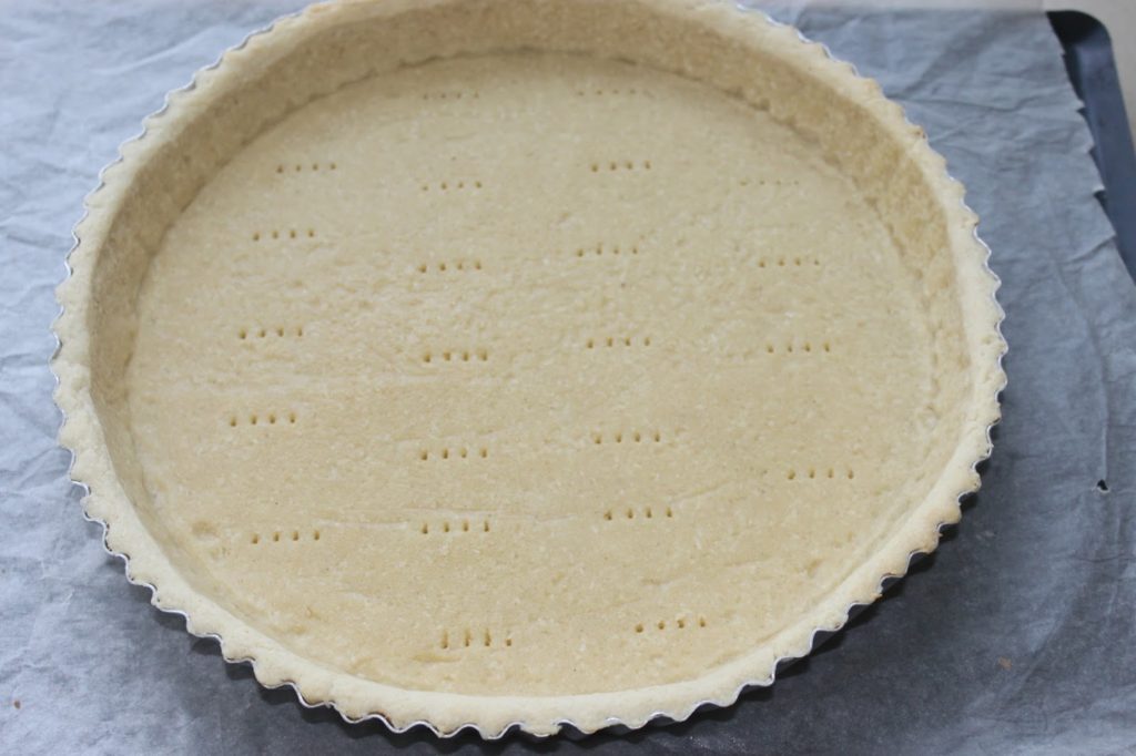 - Faites cuire à blanc avec la méthode de votre choix à 180°C pendant une vingtaine de minutes. Pour ma part j’utilise toujours le sac de farine que vous pouvez voir ICI. Enlevez le sac (ou ce que vous avez utilisé pour précuire à blanc) puis piquez le fond de pâte à la fourchette.