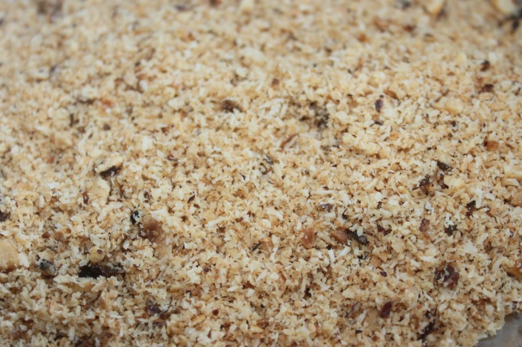 Ajoutez la noix de coco/pralin noisettes sur le dessus. Vous n’êtes pas obligés de tout mettre.