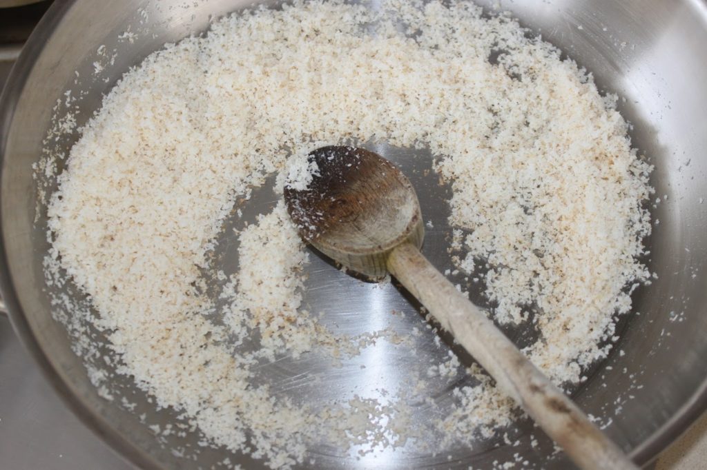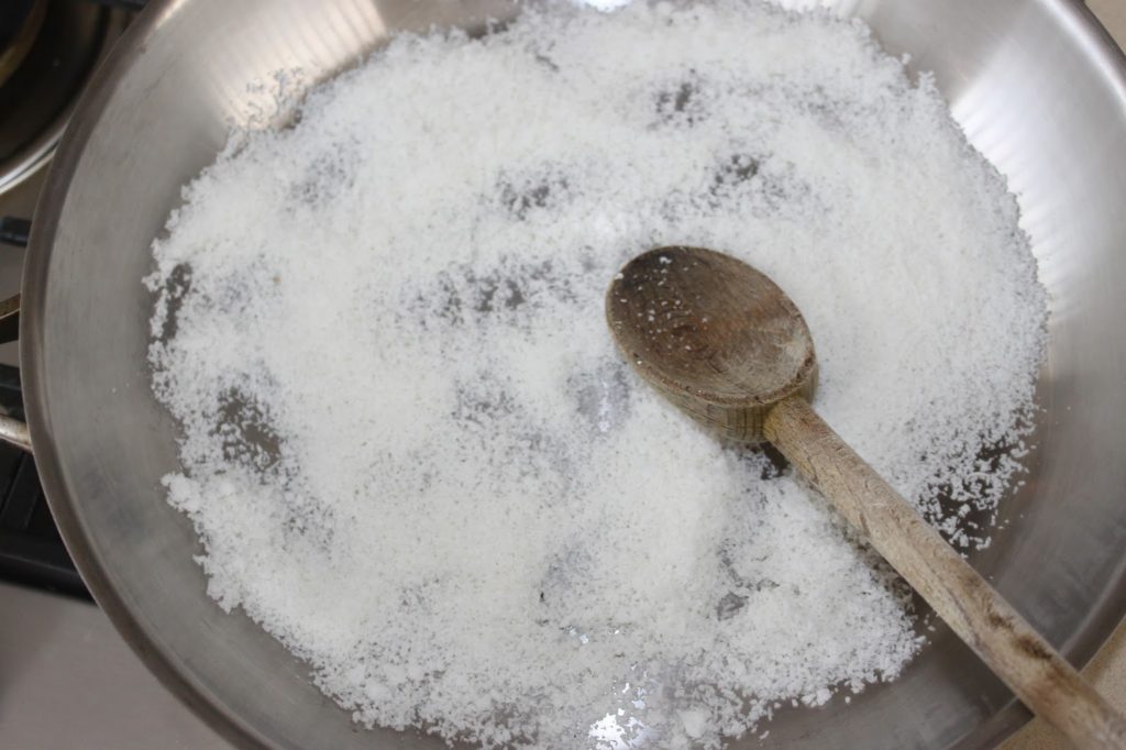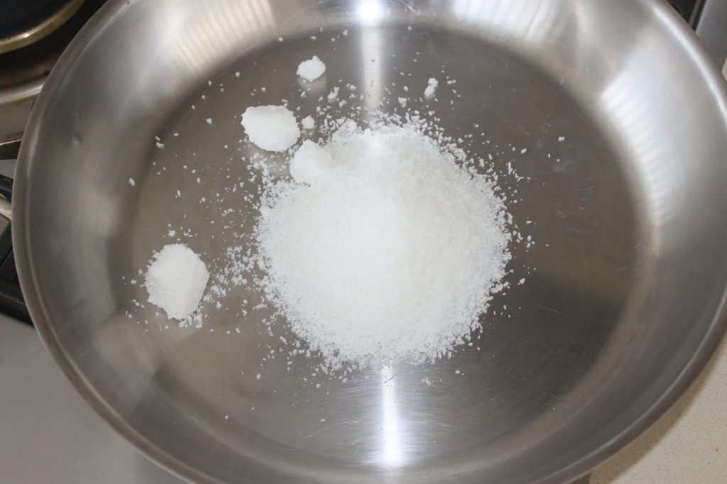 - Versez les 100g de noix de coco dans une poêle sur feu modéré.