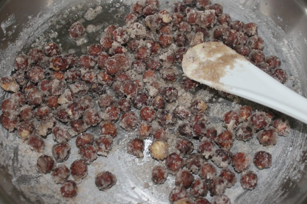 - Laissez-le ensuite refrondre en un caramel. Toutes les étapes sont visibles ICI. Versez le caramel aux noisettes sur un tapis de cuisson. Quand il est froid, mettez-le au mixeur et réduisez-le en une poudre grossière. Vous venez de faire du pralin de noisettes. Mettez de côté.