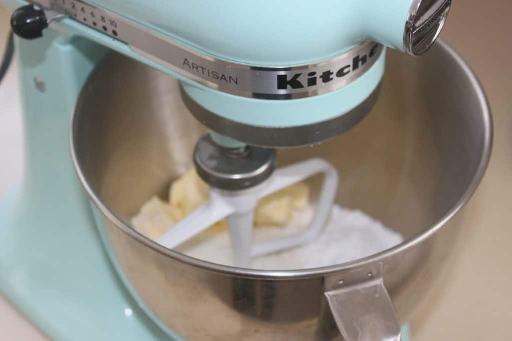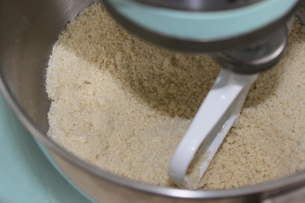 - Préparez la pâte sucrée coco. Mettez dans la cuve de votre robot ou dans un récipient, le beurre, le sucre glace, la farine, la noix de coco et la vanille.
