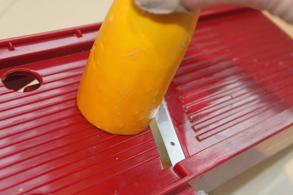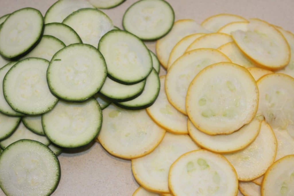 - Coupez en fines lamelles la courgette jaune et la courgette verte.
