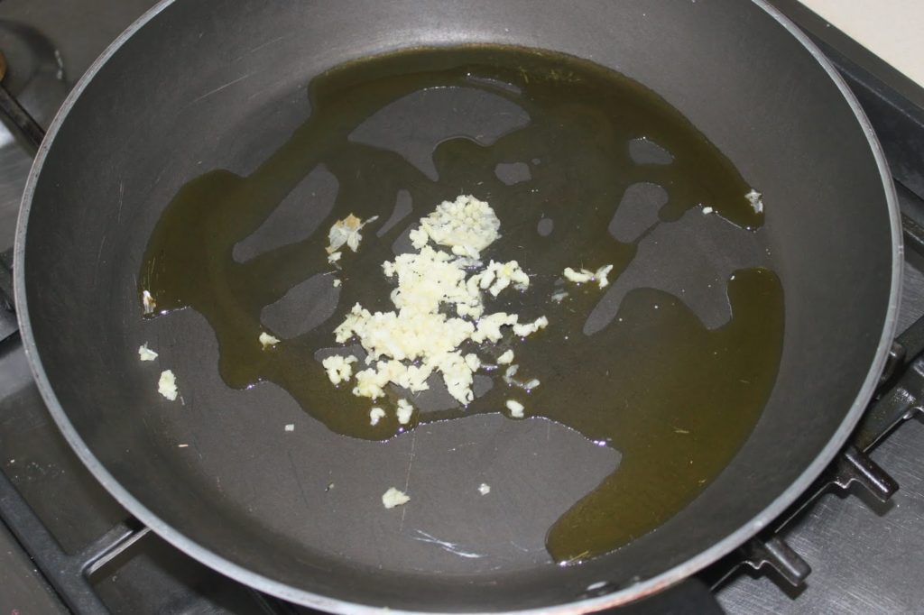Versez 6 cuillerée à soupe d’huile d’olive dans une large poêle avec les gousses d’ail épluchées et finement coupées.