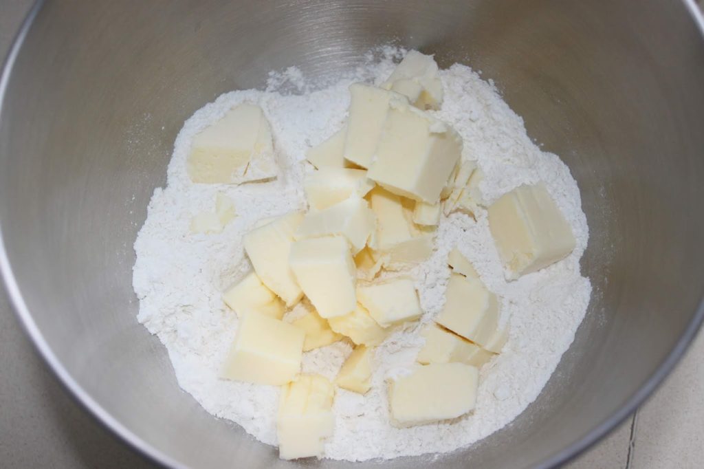 - Commencez par préparer la pâte. Versez la farine, le sucre et le beurre coupé en morceaux dans la cuve de votre robot ou dans un récipient.